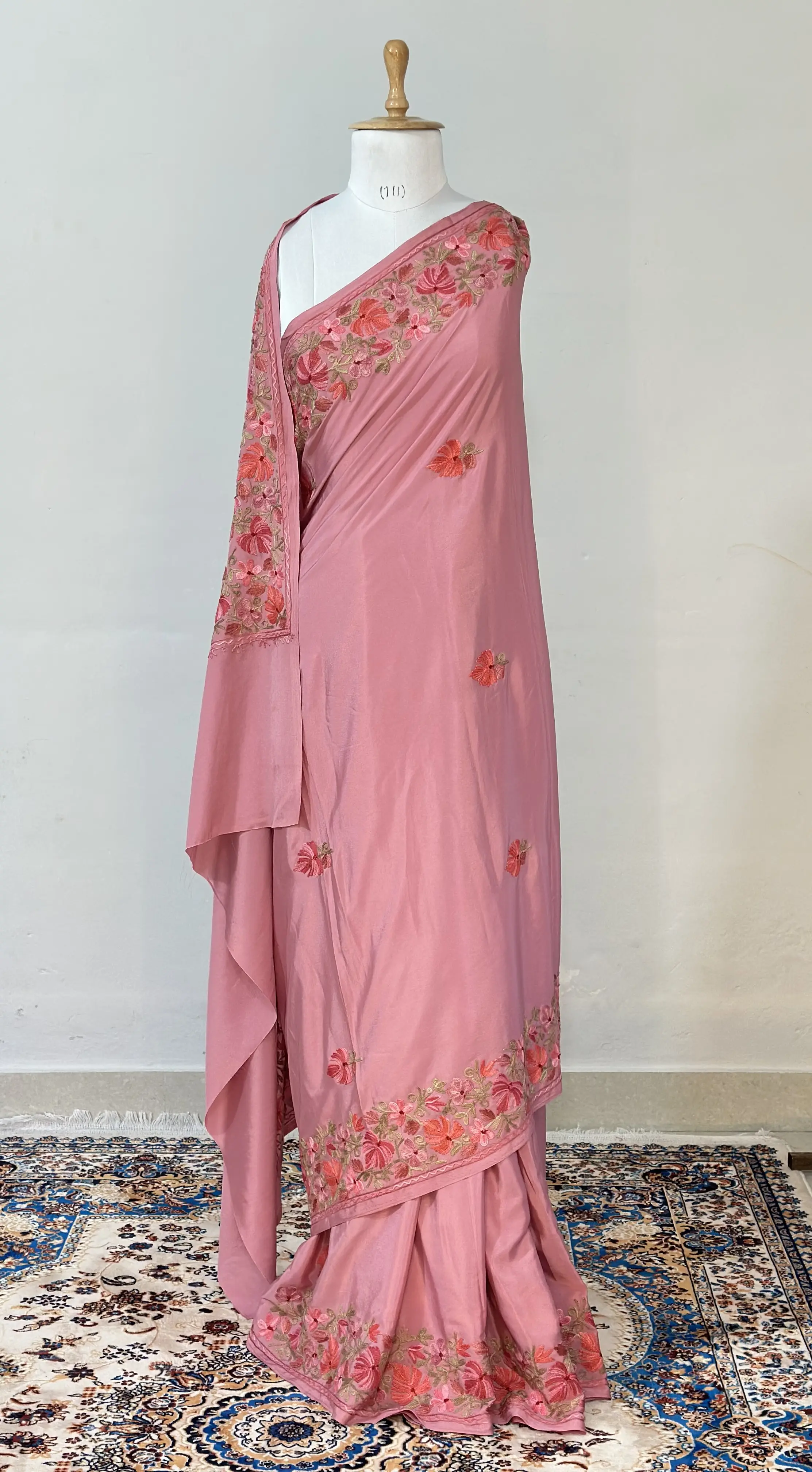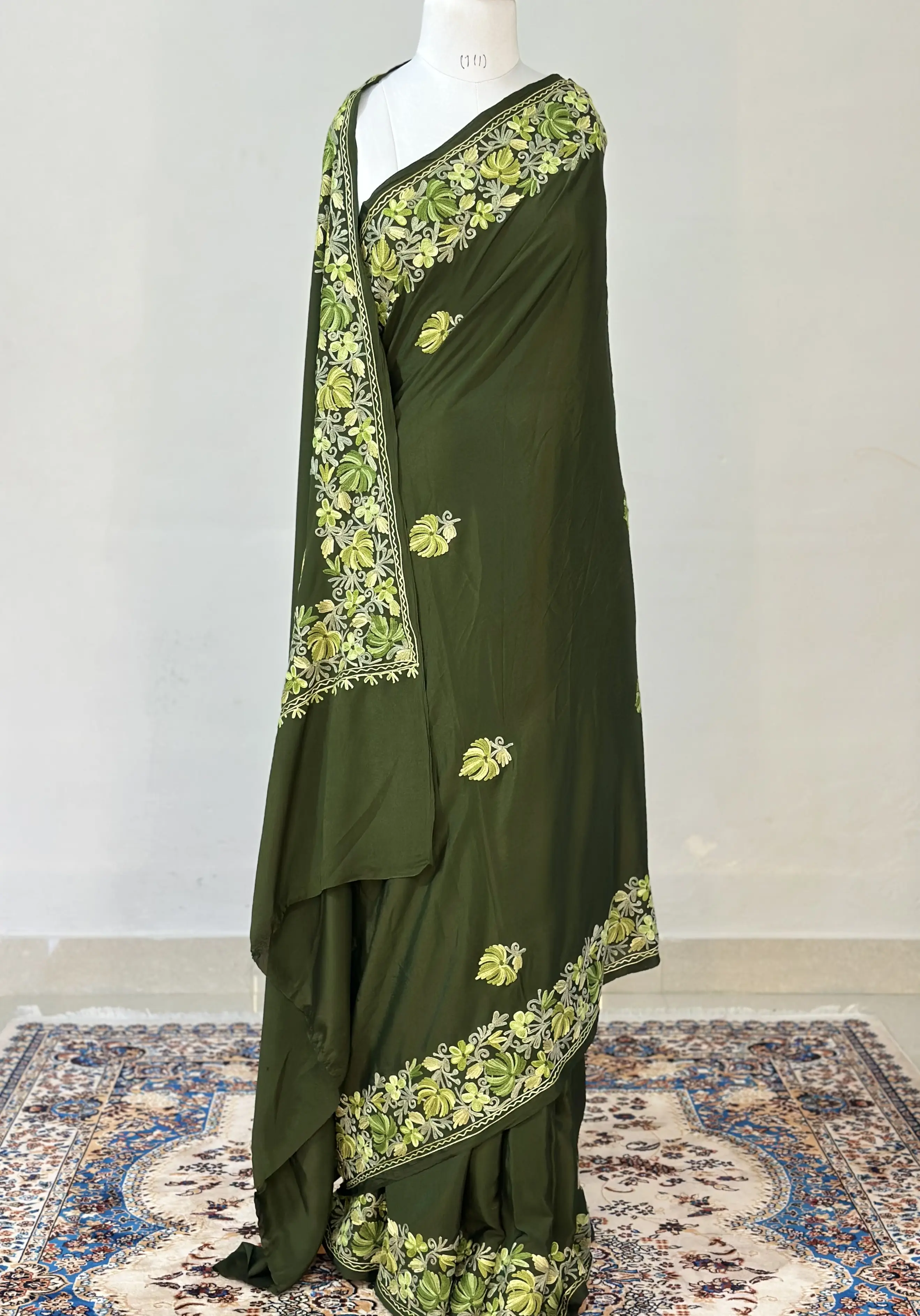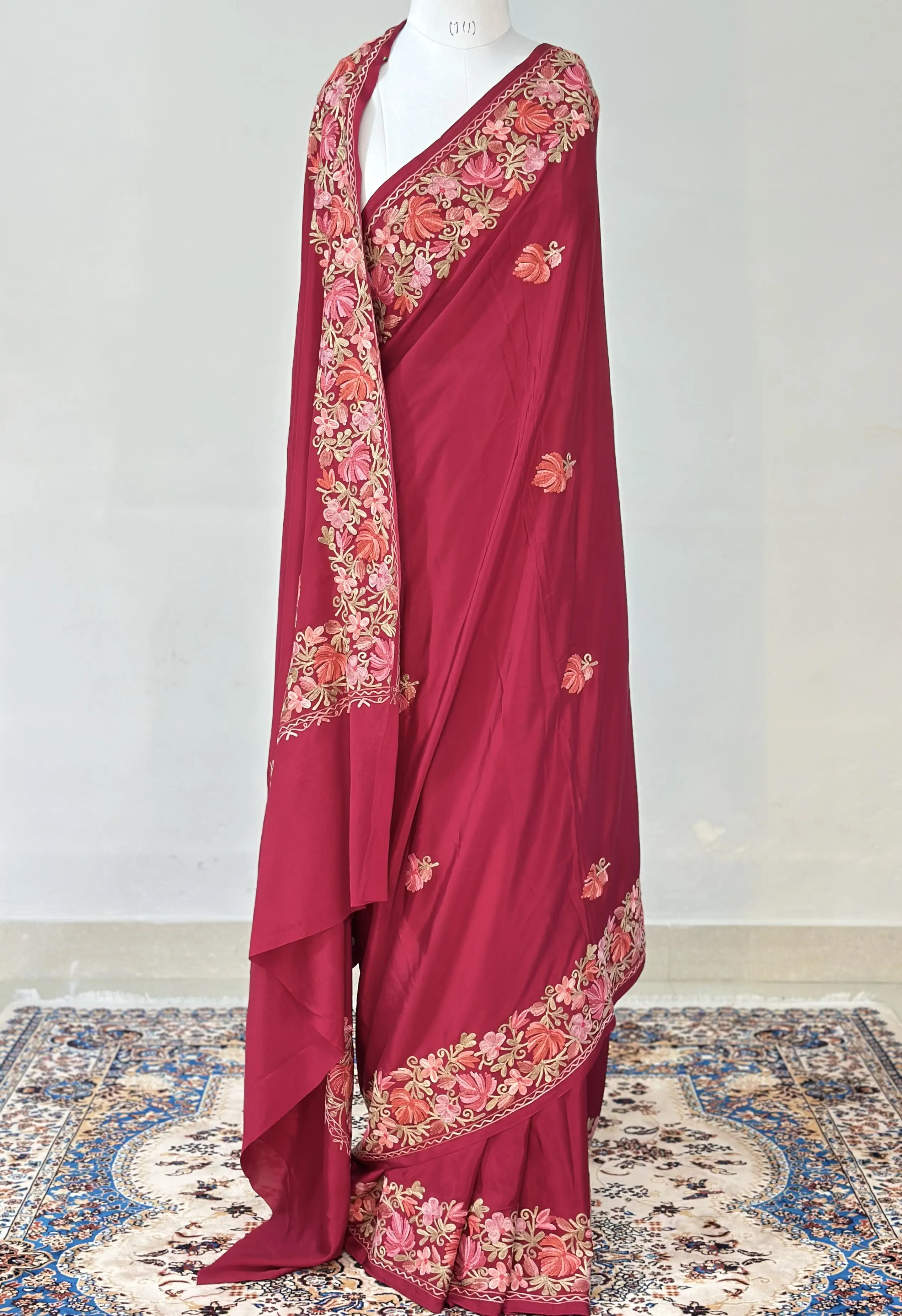 Experience timeless elegance with our Silk Saree featuring exquisite Ari work inspired by traditional Kashmiri art. Crafted from premium-quality silk, this saree radiates a natural sheen and graceful drape, making it perfect for weddings, festive celebrations, and special occasions.