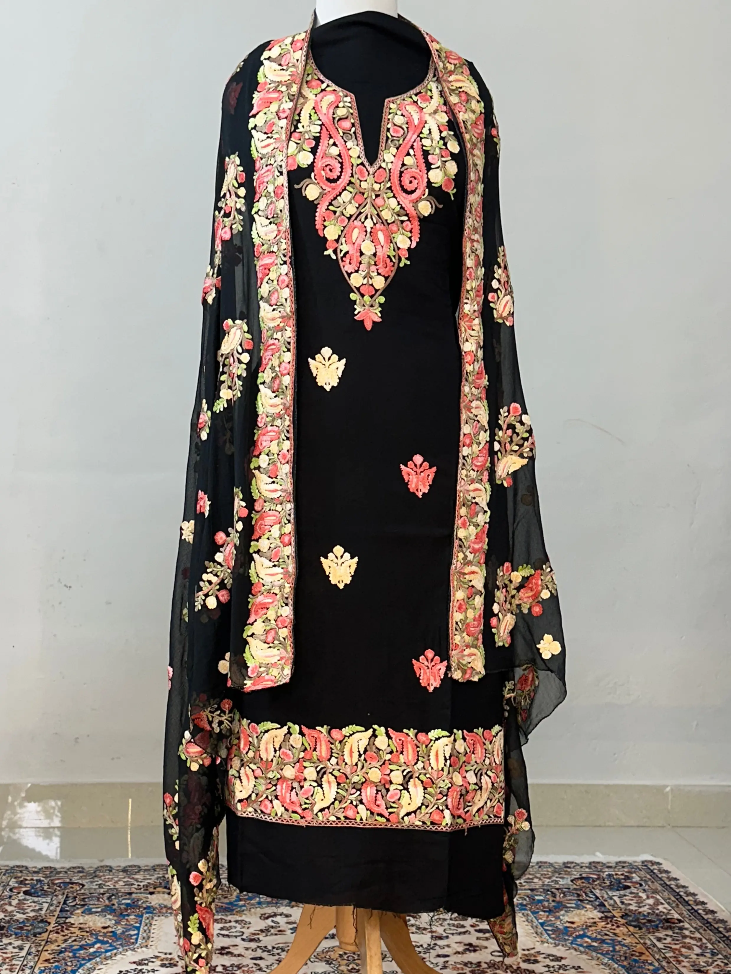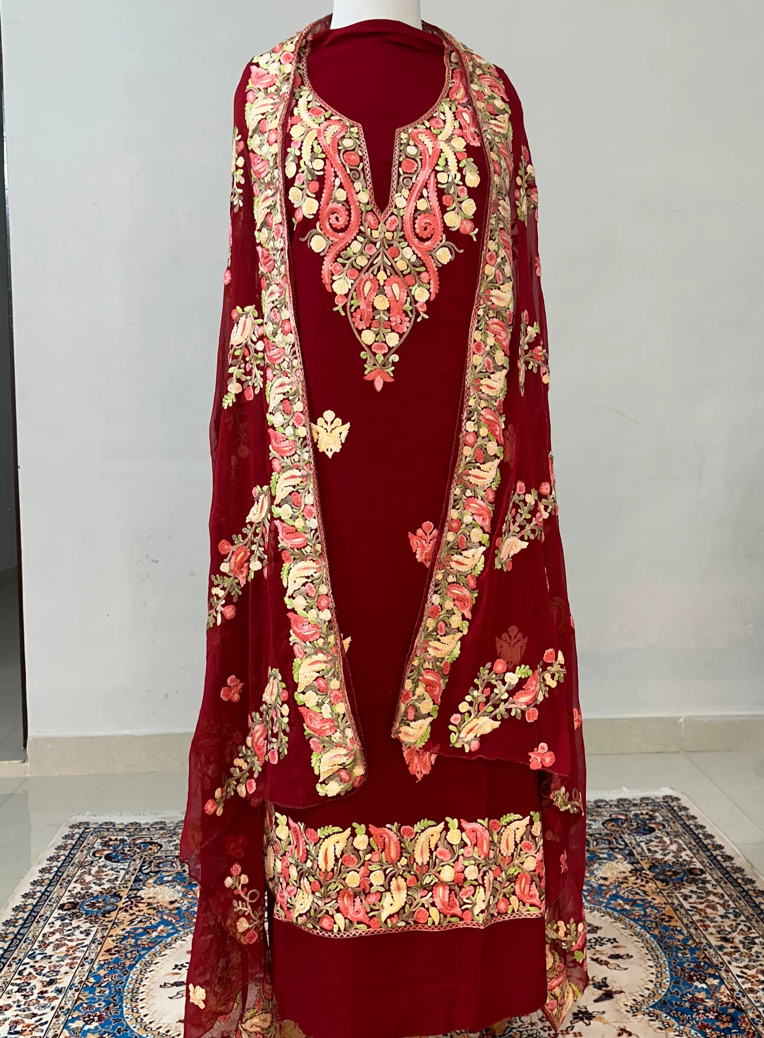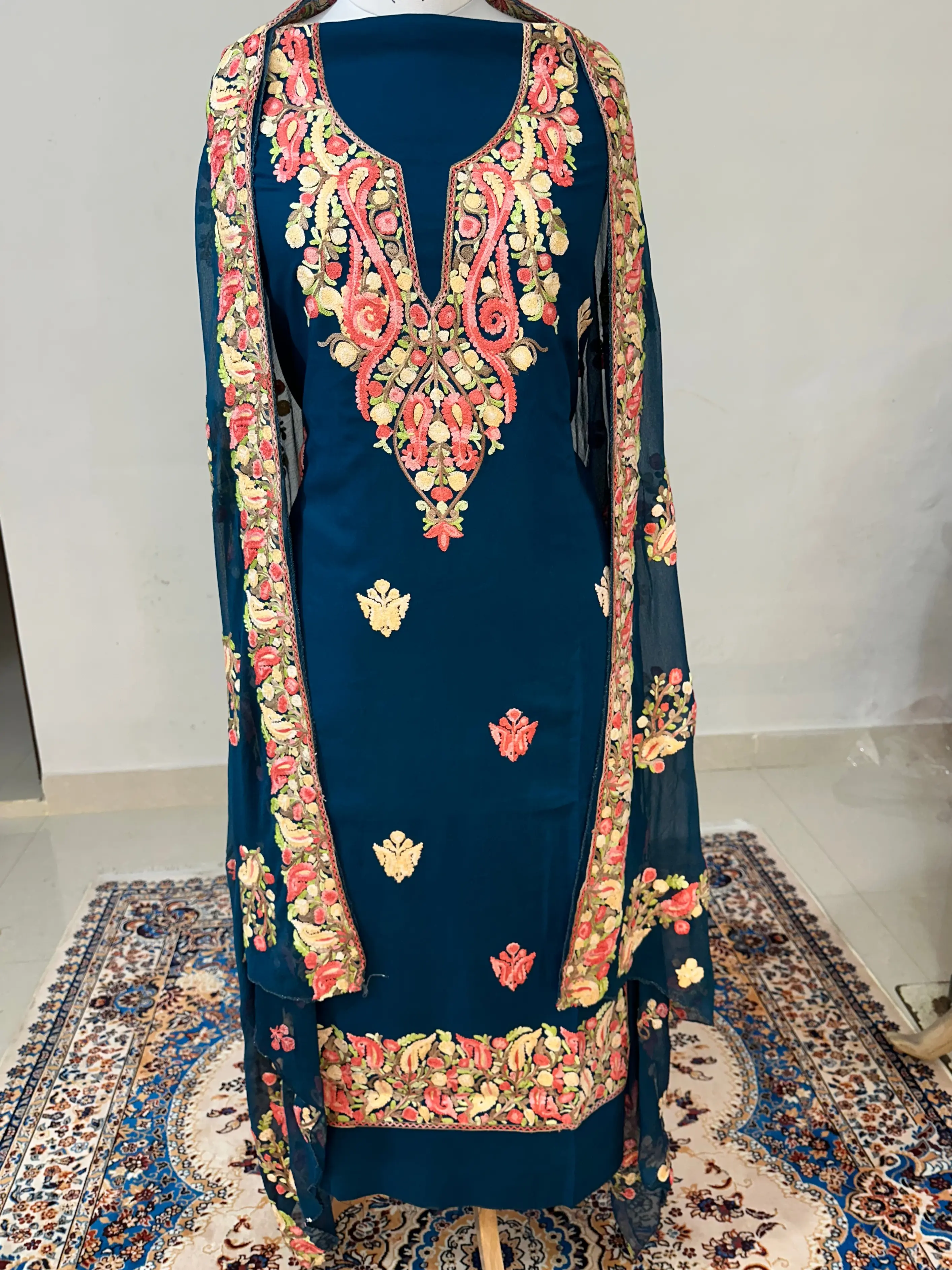 - Heavy Kashmiri Ari Work: The suit features intensive, multi-thread Heavy Ari Embroidery, a signature hook-needle technique of Kashmir. This high-density work ensures a vibrant, raised, and durable pattern, often applied prominently across the neckline, sleeves, and border.