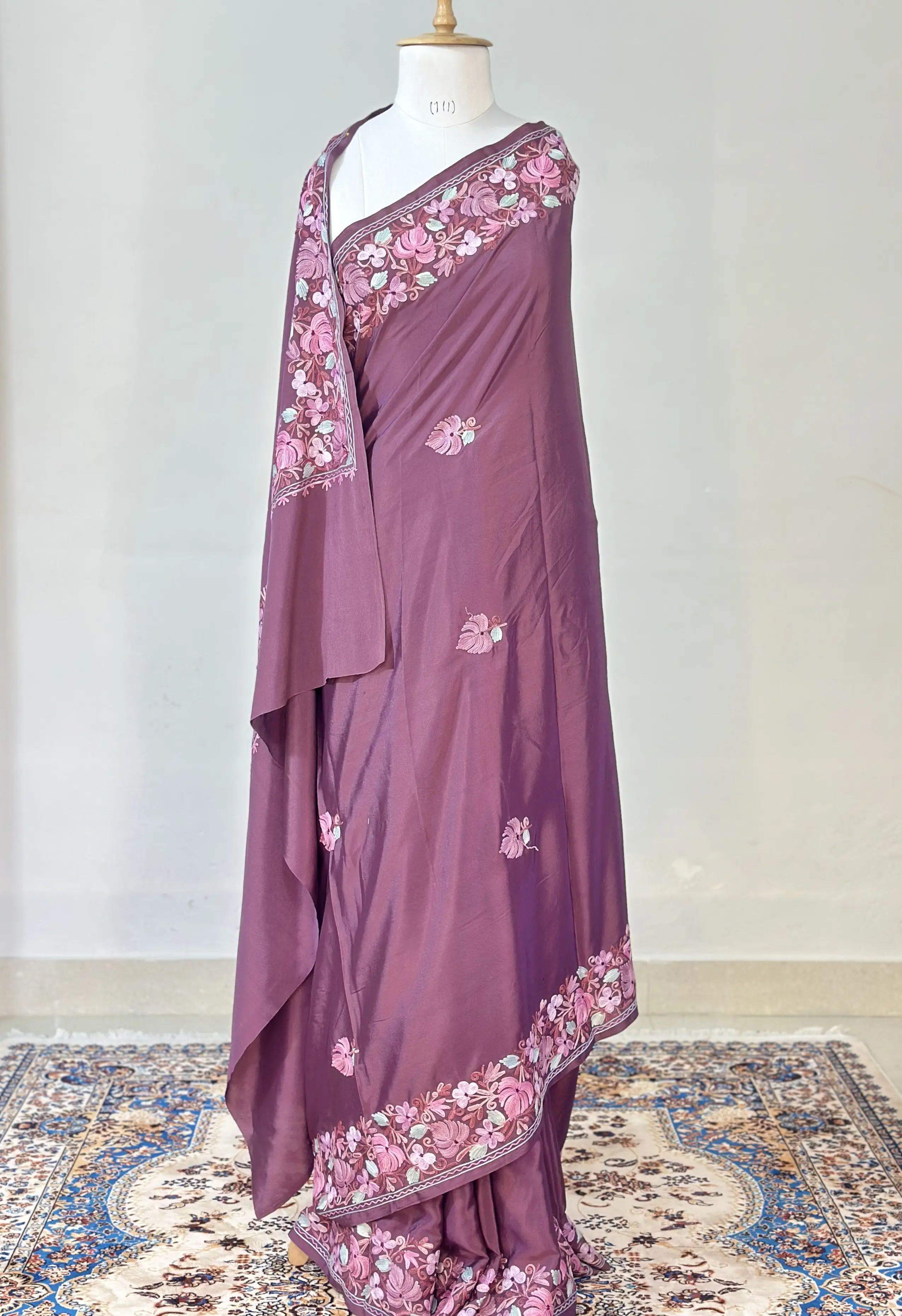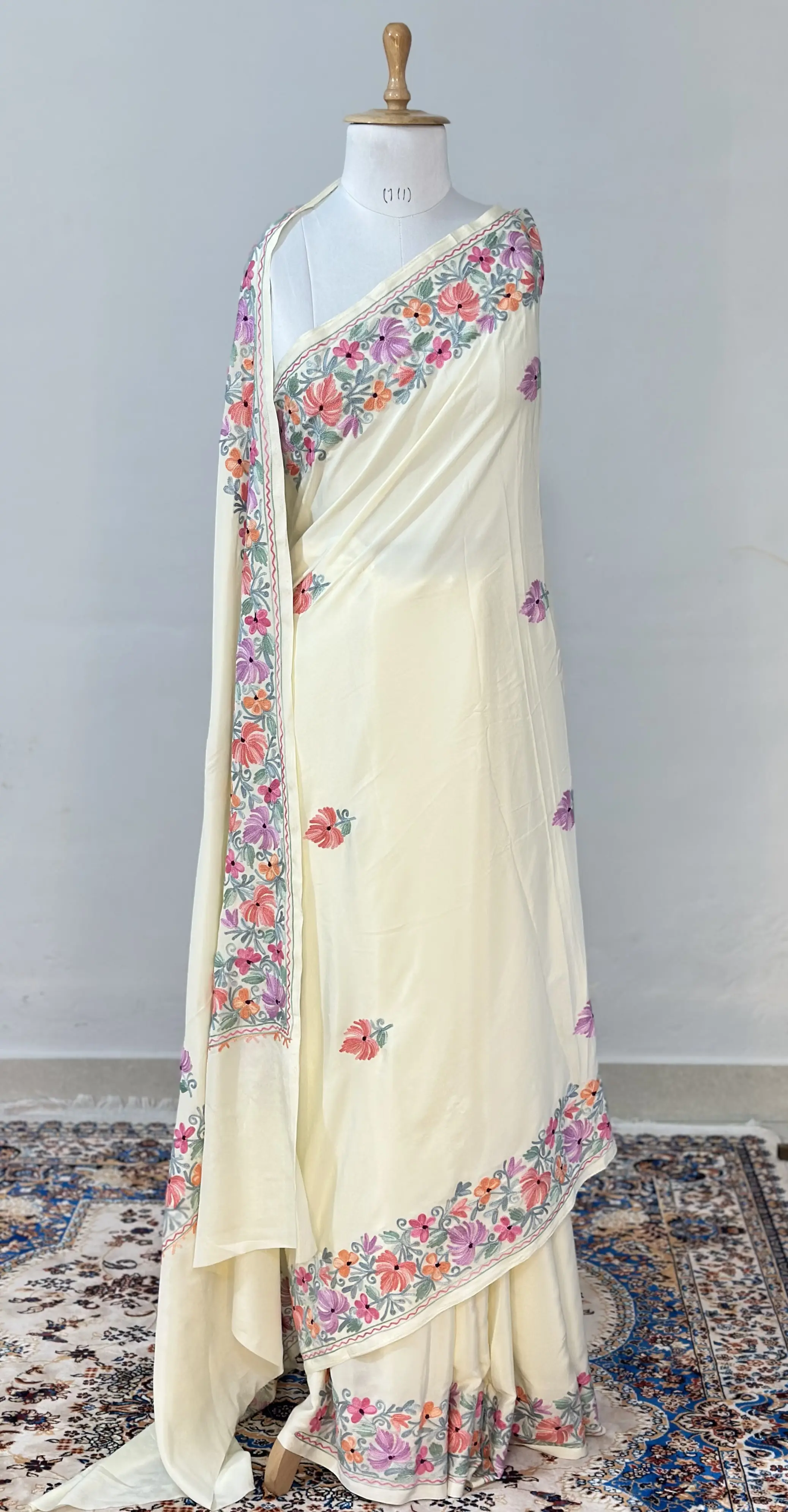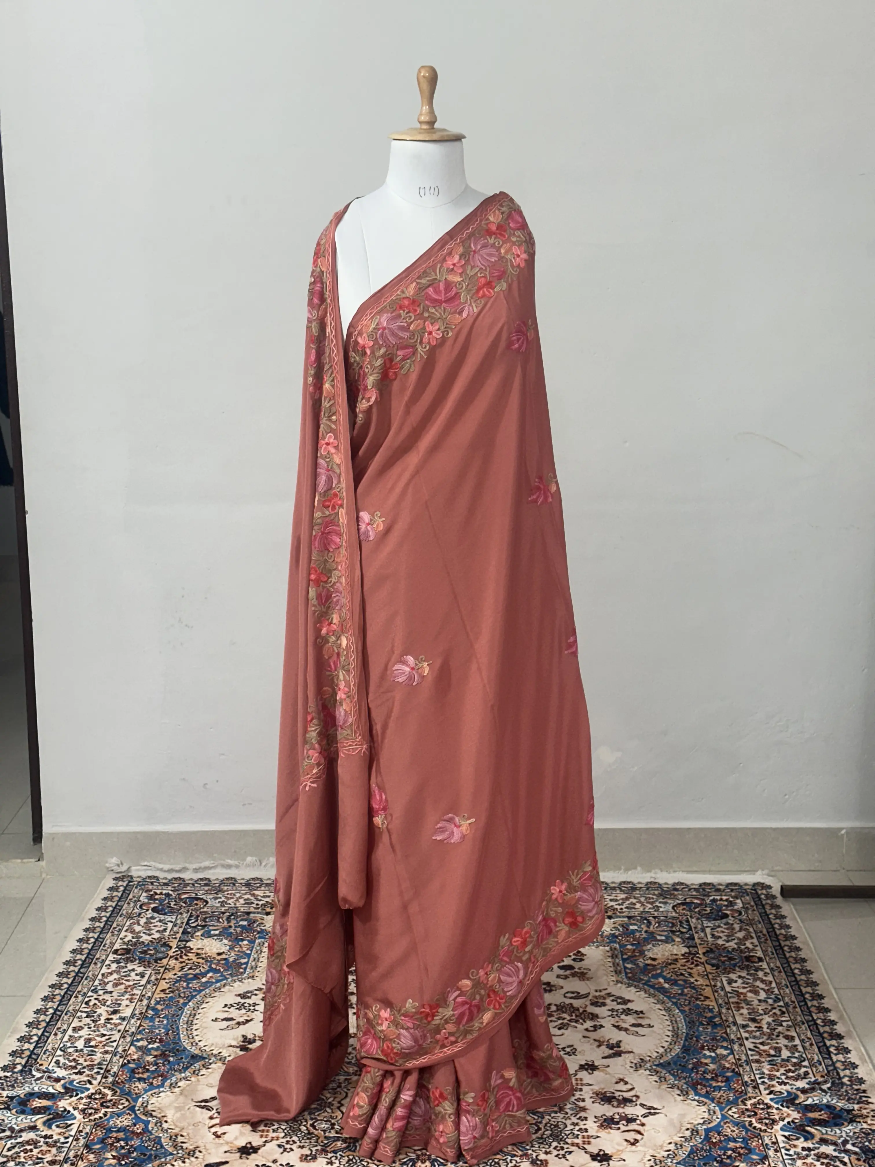 Experience timeless elegance with our Silk Saree featuring exquisite Ari work inspired by traditional Kashmiri art. Crafted from premium-quality silk, this saree radiates a natural sheen and graceful drape, making it perfect for weddings, festive celebrations, and special occasions.