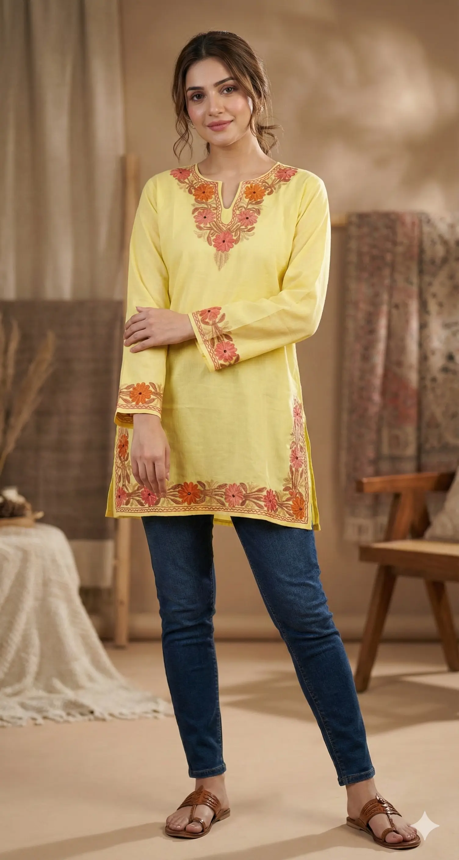 Stay effortlessly chic this season with our Short Summer Cool Kashmiri Kurti which is made from lightweight, breathable fabric that is perfect for warm days and relaxed outings. Add a touch od tradition to your modern style with this beautifully embroidered kashmiri kurti.